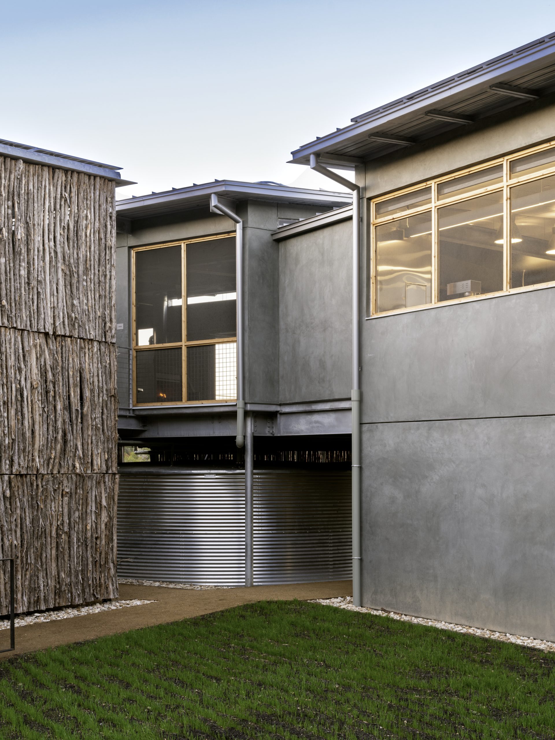 The Campsite at Shield Ranch serves as a living learning model for sustainable design and conservation. The facility is entirely off the grid, operating independently of public utilities. Electricity is generated by solar power, and water is supplied through a carefully designed rainwater harvesting system. Rainwater from the pavilion and shower building roofs is stored in reservoirs with a combined capacity of 67,800 gallons.
